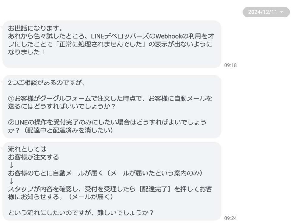 お店の方が動画を見てくれて、カスタマイズしたい!とのご相談をいただきました。GoogleのGAS(プログラミング基盤)とLINEを組み合わせて、飲食店の方向けを想定したオーダーシステムです。